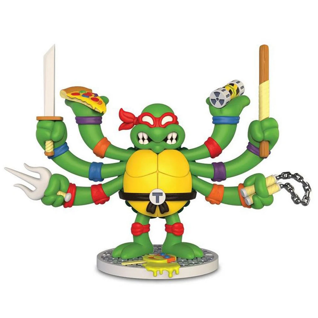 Multiple arms, each representing a different turtle & holding numerous iconic items.